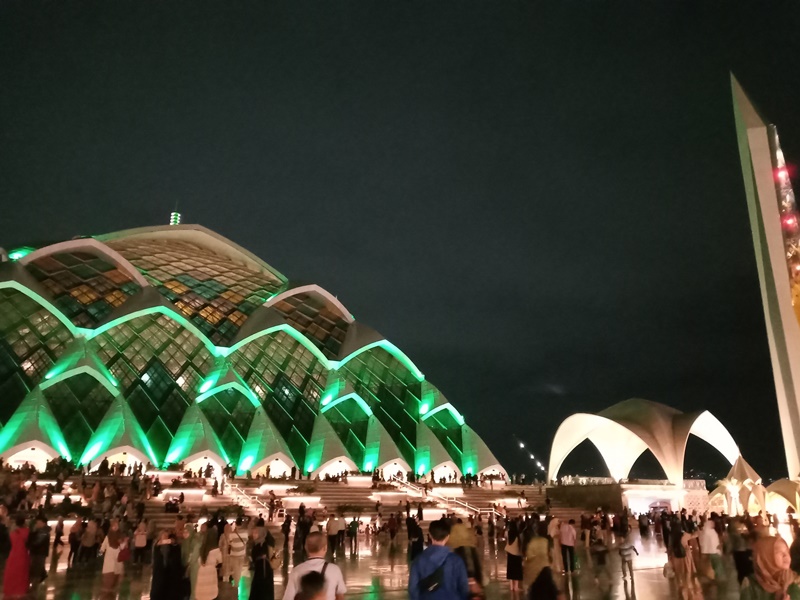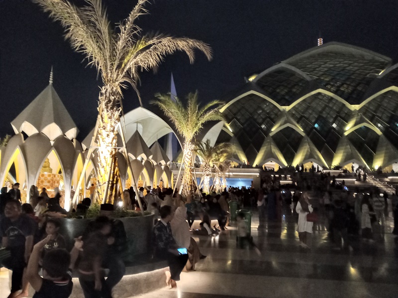 Foto Penampakan Masjid Raya Al Jabbar Malam Hari. Lampu di setiap sisi bangunan Masjid Raya Jawa Barat ini menghasilkan gradasi warna-warni terang saat malam hari. Foto diambil Jumat (7/7/2023) malam pukul 18.30 WIB. (Mel).