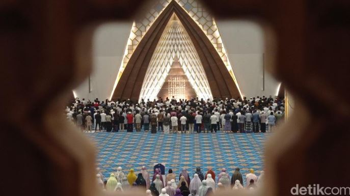 Pihak DKM dibantu TNI untuk pengamanan, termasuk menyiapkan penitipan sandal. Pada shalat tarawih pertama ini, Masjid Raya Al Jabbar tampak tak terlalu penuh. (Antara).
