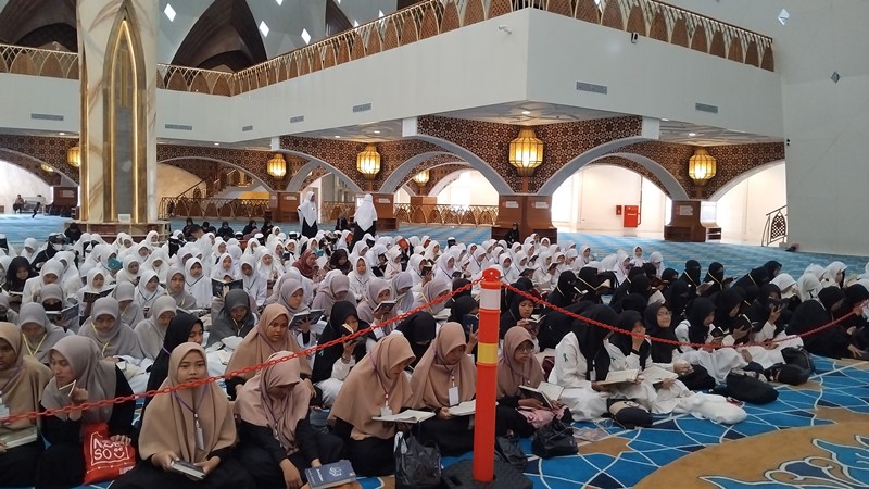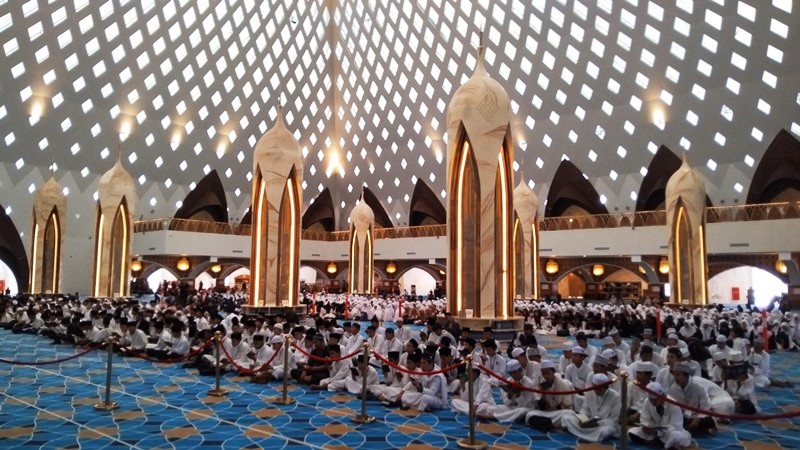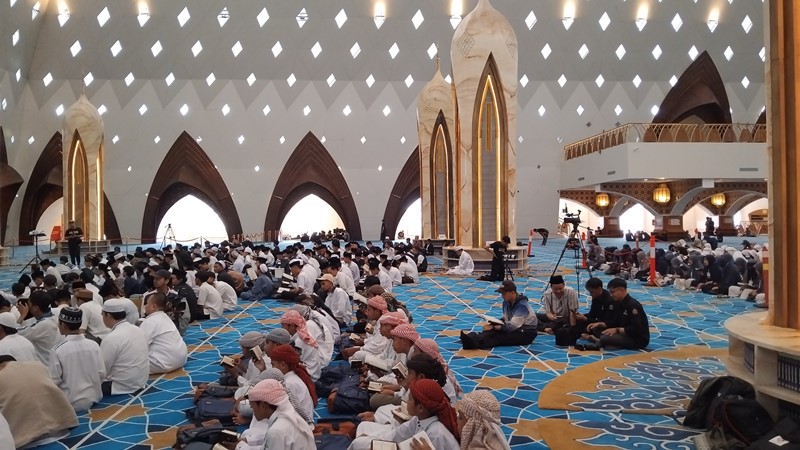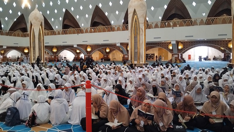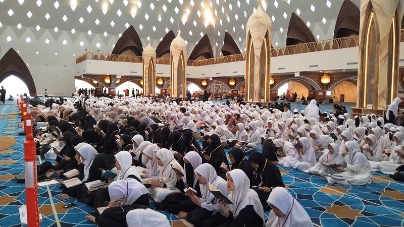 Sekitar 1000 santri dari 30 pondok pesantren se-Bandung Raya khataman Al-Qur’an di Masjid Raya Al Jabbar, Ahad, 16 Maret 2025. Acara diinisiasi Masjid Baitul Huda – Masjid Makan Makan Antapani Bandung.