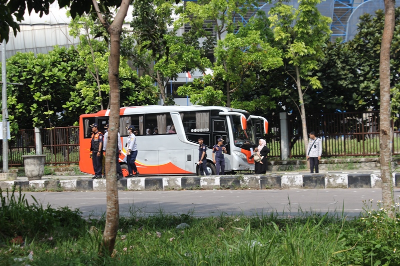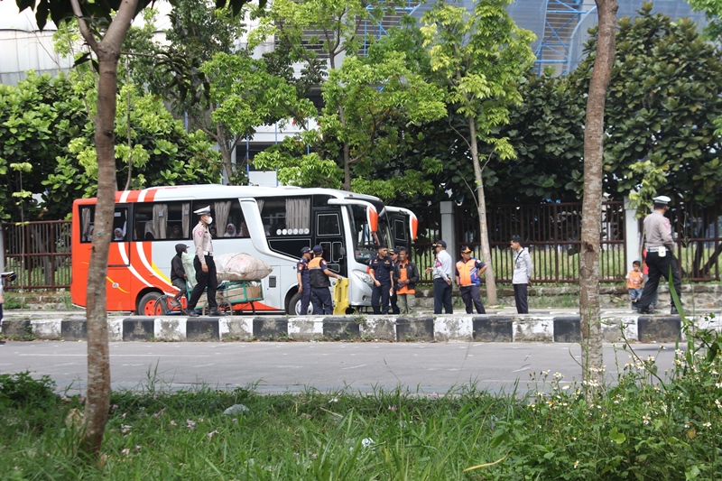 Dishub Kota Bandung bersama polisi Polrestabes Bandung Polsek Gedebage merazia klakson basuri alias telolet bus-bus yang menuju dan pulang dari Masjid Raya Al Jabbar di depan Stadion GBLA, Sabtu (5/10/2024).